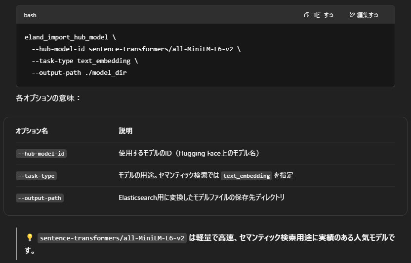 ここでは、Hugging Face で公開されている Sentence Transformers モデルを使用し、「eland_import_hub_model」コマンドでElasticsearch用に変換します。